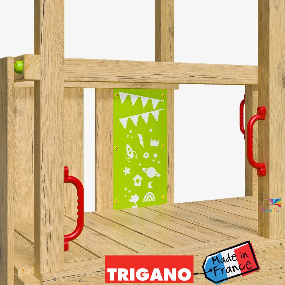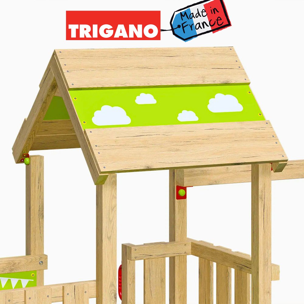 • Finitions soignées et accessoires ludiques : glissière bicolore, toit en bois et bâche, télescope, planches de stickers pour personnaliser les éléments