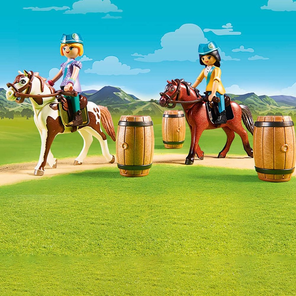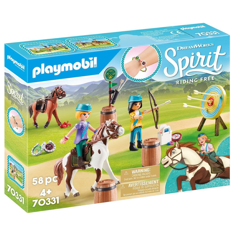 - Naturellement, Abigail et Ursula et leurs chevaux Boomerang et Bing Cherry ne doivent pas manquer la grande aventure en extérieur. Durant la compétition entre les PALs – Pru, Abigail et Lucky et les BUDs – Bebe, Ursula et Daphne, Abi et Ursula lancent le défi suivant : Barrel Riding. Lors du Barrel Riding – course de tonneaux, il faut sauter à cheval par dessus des tonneaux. Et il faut ensuite tirer à l’arc. Chaque fillette tire six flèches à la suite sur la cible, qui est donc la plus habile à l’arc ? Un superbe insigne de fer à cheval et un bracelet attendent la gagnante en guise de récompense. Abigail est folle des bracelets colorés et emmène toujours sa collection dans sa poche. Le PlaySet Aventures en extérieur comprend les personnages Spirit Abigail et le cheval Boomerang et Ursula avec le cheval Bing Cherry, ainsi que deux tonneaux pour la course de saut de tonneaux, une cible, six flèches et un arc pour le tir à l’arc. Pour les grands fans de Spirit, le set Base d’Entraînement -Playmobil comprend un bracelet d’amitié avec deux clips en forme de fer à cheval à collectionner.