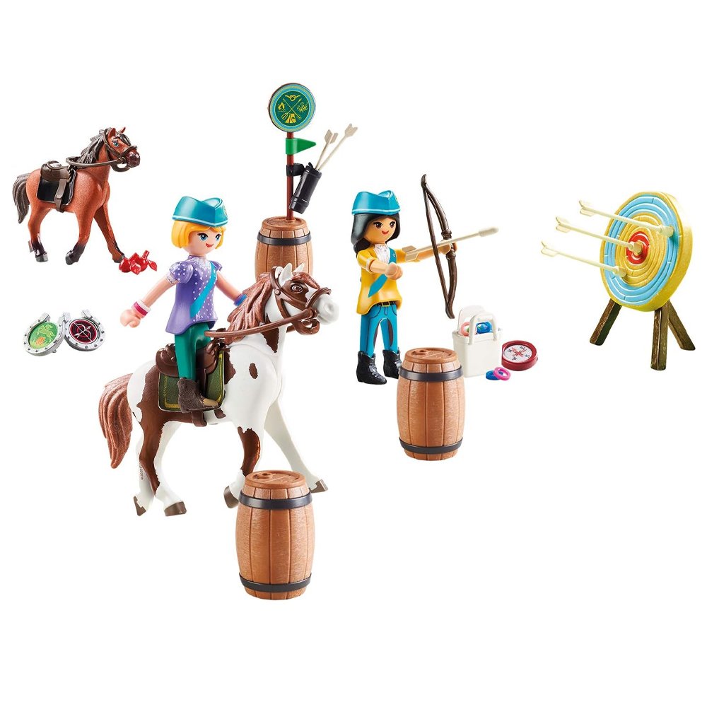 - Les personnages peuvent s’entraîner à la base d’entraînement aux courses d’obstacle et au tir à l’arc. Avec Abigaëlle et Boomerang, Maricela et son cheval. La Base d’Entraînement -Playmobil Spirit contient deux chevaux, deux personnages, trois tonneaux, une cible, des accessoires (flèches, harnais, selles, arc…) et un bracelet.