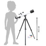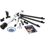 Avec tous les accessoires pour l’observation nocturne : trépied de sol de 89 cm, lentille de 50 mm de diamètre, objectif chercheur de 6×25 mm, 2 oculaires interchangeables, 1 lentille de Barlow 2.3x.