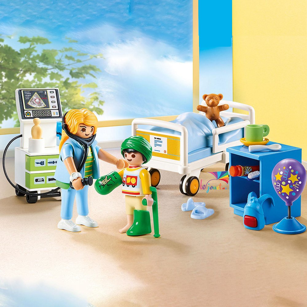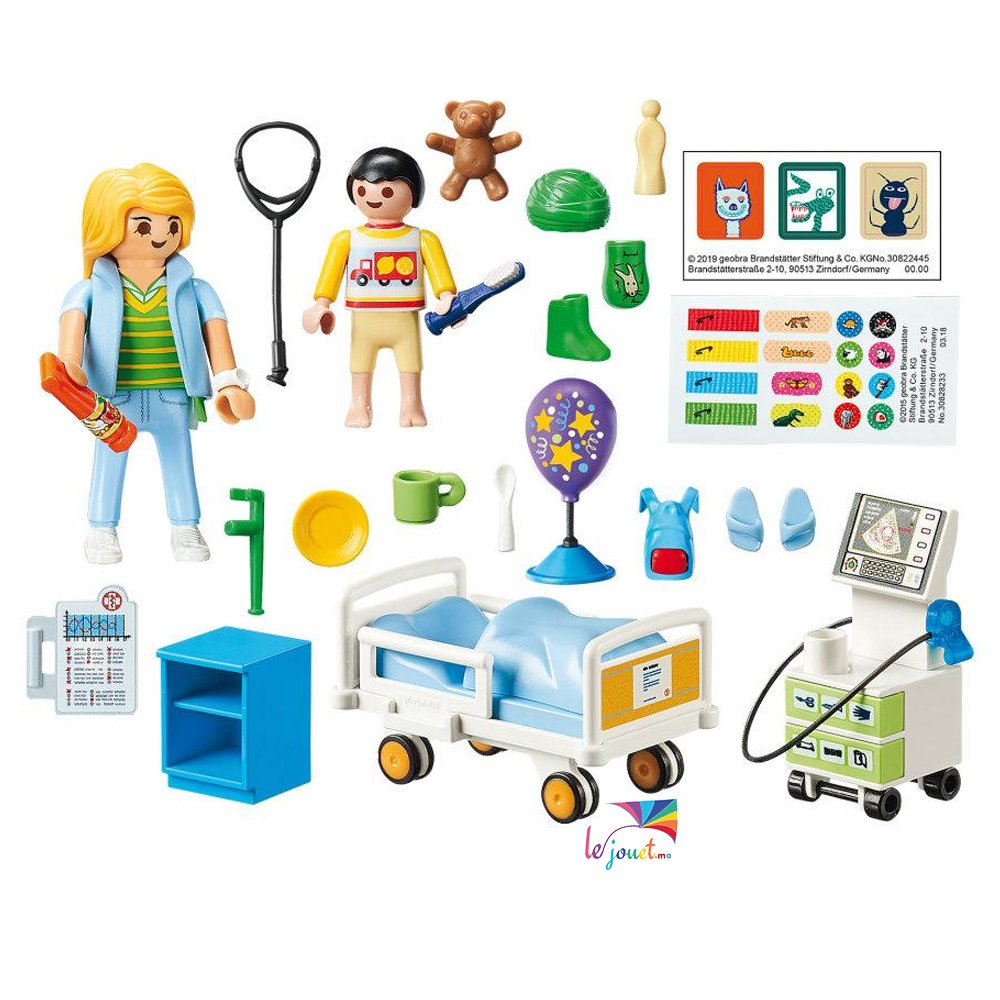 La boîte Chambre d’hôpital pour enfant Playmobil comprend 47 pièces, 2 figurines, 1 lit, 1 appareil à échographies, 1 armoire et des accessoires comme un ballon, un sac à dos, 1 tasse, 1 cuiller…
