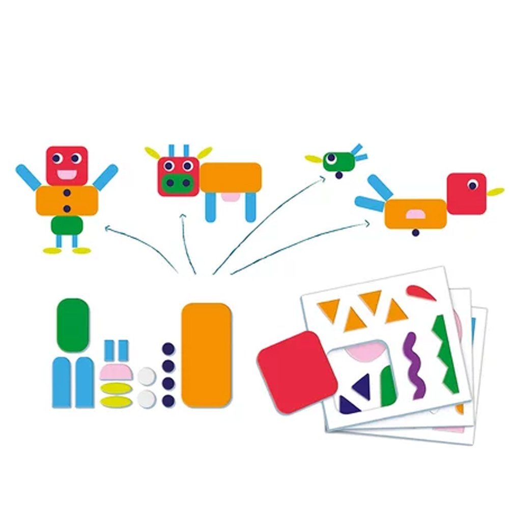 Le jeu créations infinies de Clementoni contient de nombreuses cartes de différentes tailles à combiner pour créer des objets, des animaux ou des scènes.