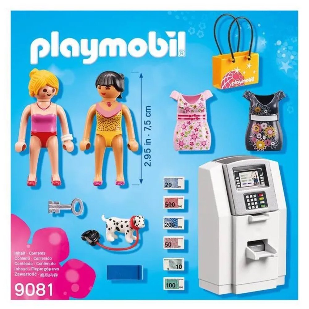 L’ensemble DISTRIBUTEUR AUTOMATIQUE – PLAYMOBIL CITY LIFE comprend 2 figurines, 1 chien, 1 distributeur, 1 sac shopping, 1 laisse, 1 carte bancaire, 1 clé et 6 billets différents.