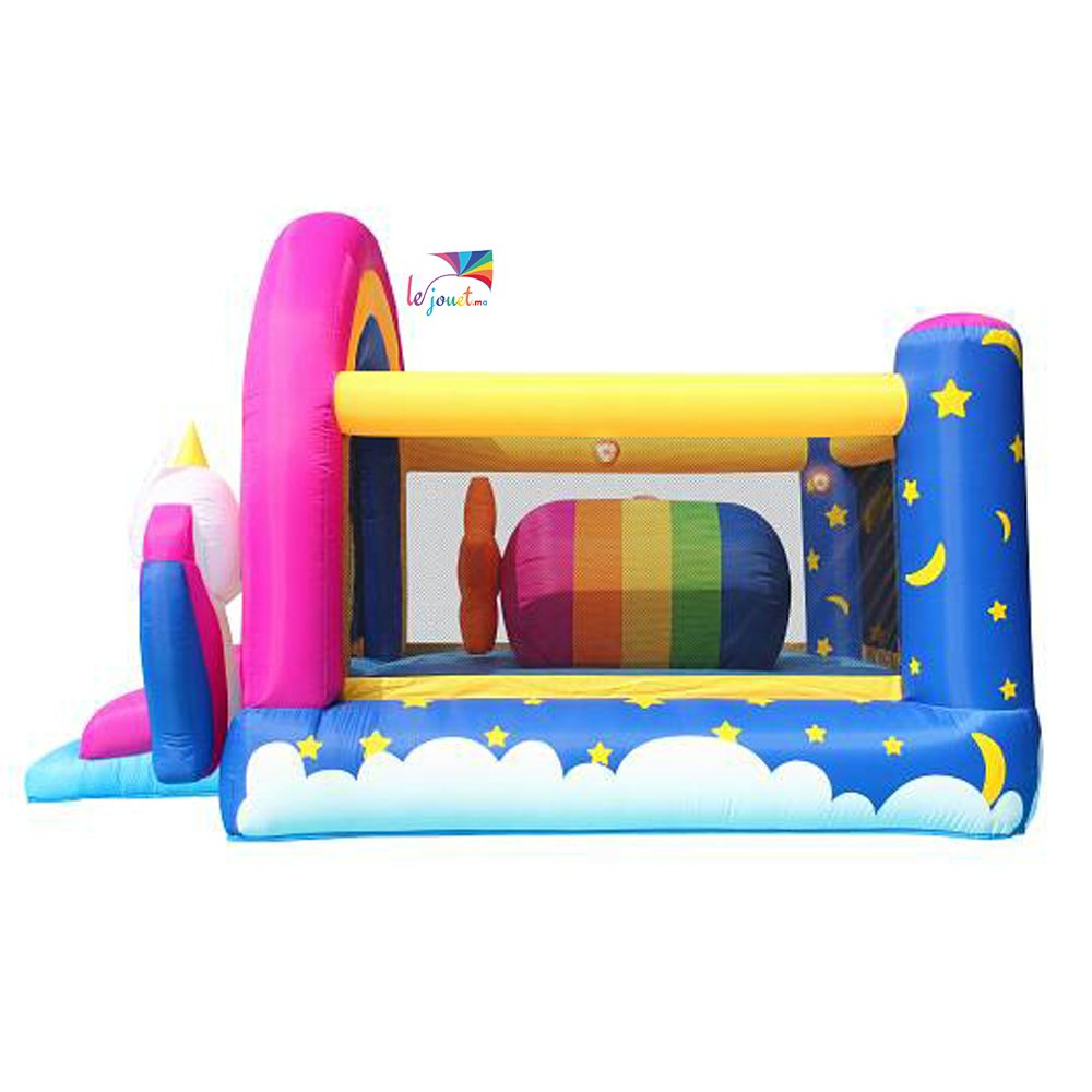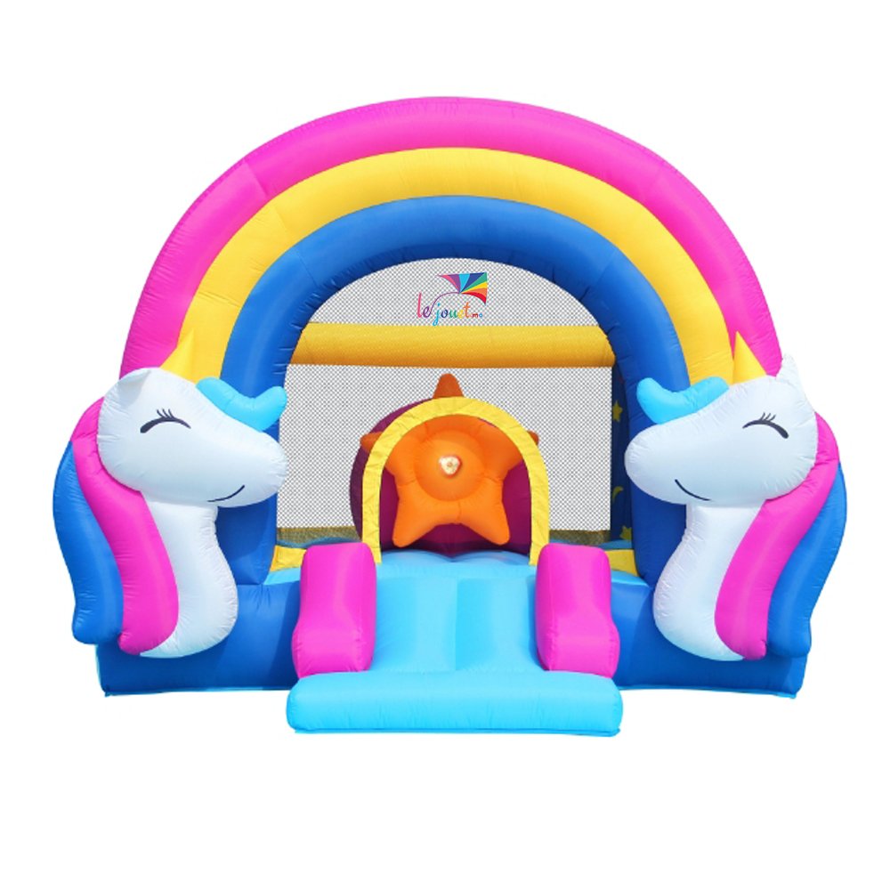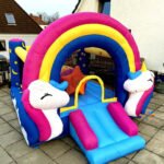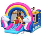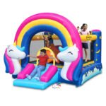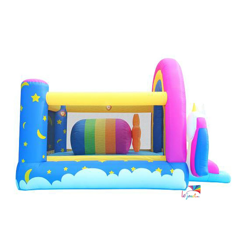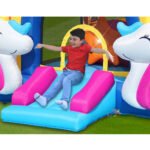 Cette Grande Aire de jeux gonflable FANTASY UNICORN – Happy hop est inspiré par le monde des licornes et des arcs-en-ciel, parfait pour plaire aux enfants qui adorent ces thèmes féeriques.