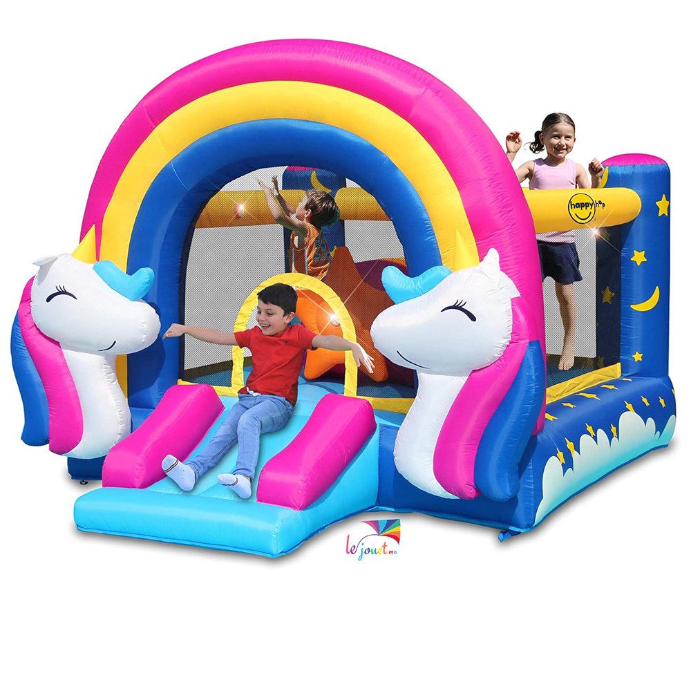 La Grande Aire de jeux gonflable FANTASY UNICORN de Happy Hop (modèle 8004) est un équipement coloré qui offre un espace de jeu interactif pour les enfants, incluant un saut et un toboggan.