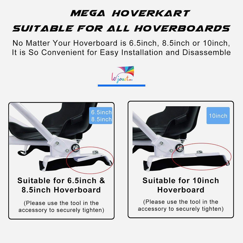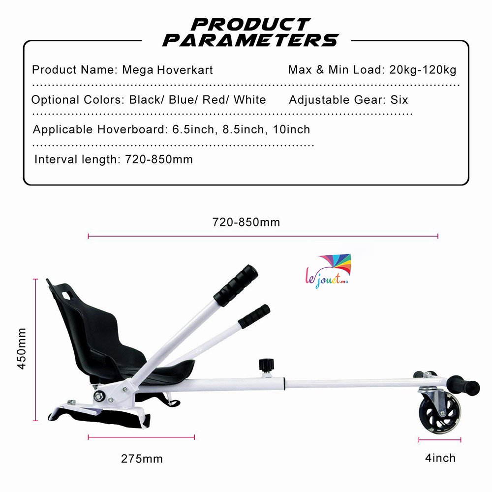 ✔️ Caractéristiques: Convient aux planches hover avec roues de 6,5 pouces. Longueur du cadre / position du siège ajustable. Attachez en quelques secondes. Siège inspiré de la course. Poids maximum 120kg. Hauteur utilisateur minimum 100cm. Hauteur maximale utilisateur 200cm.