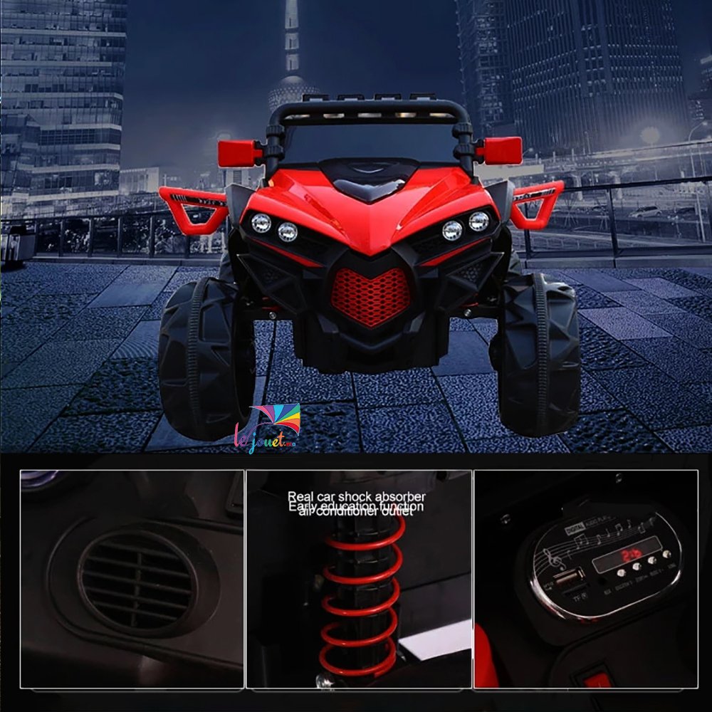 Sur la console il y a un panneau de son avec des airs joyeux. Il dispose également d’une entrée MP3, USB et SD vous donnant la possibilité de jouer vos chansons préférées. Les lumières LED avant doubles et arrières augmentent l’attractivité du véhicule.