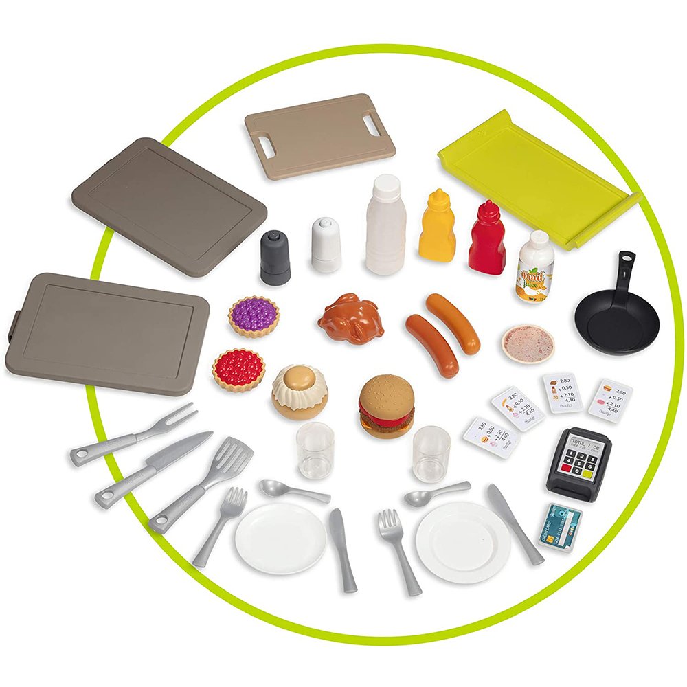 Entrez dans l’univers de la MAISON de Chef – Smoby ! Cette maison regroupant des fonctions liées à la cuisine et à la marchande permettra à votre enfant et ses amis de préparer les commandes de leurs clients, les servir, et encaisser l’argent comme un véritable restaurant extérieur ! De nombreux accessoires sont inclus : réfrigérateur, four, gazinière avec flammes rétractables, évier avec robinet, caisse enregistreuse avec tiroir-caisse, étagères de rangement, aliments et boissons, couverts, sauces etc.