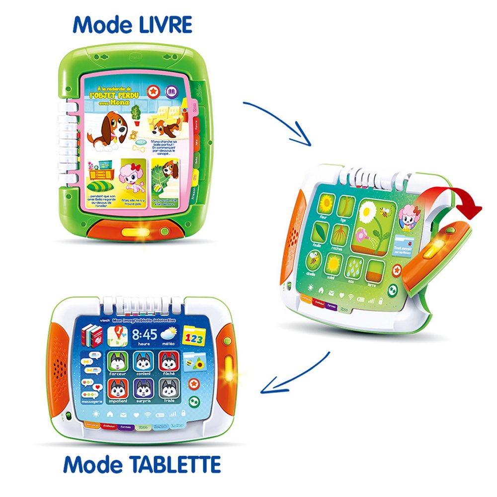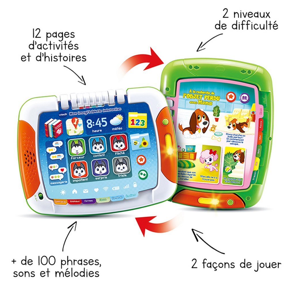 Mon imagi’tablette interactive offre deux côtés d’apprentissage pour deux fois plus de fun ! En un tour de main, la tablette d’activités se transforme en livre d’histoires.