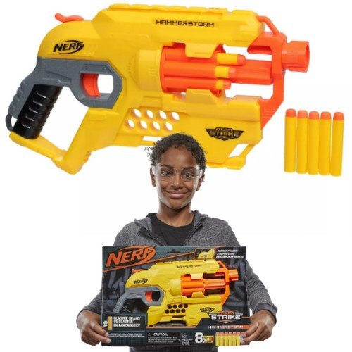 Inclus : blaster Nerf Alpha Strike Hammerstorm et 8 fléchettes.