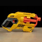 ARMEMENT PAR PERCUTEUR : On arme le blaster en abaissant le percuteur, puis on appuie sur la détente pour tirer une fléchette