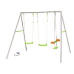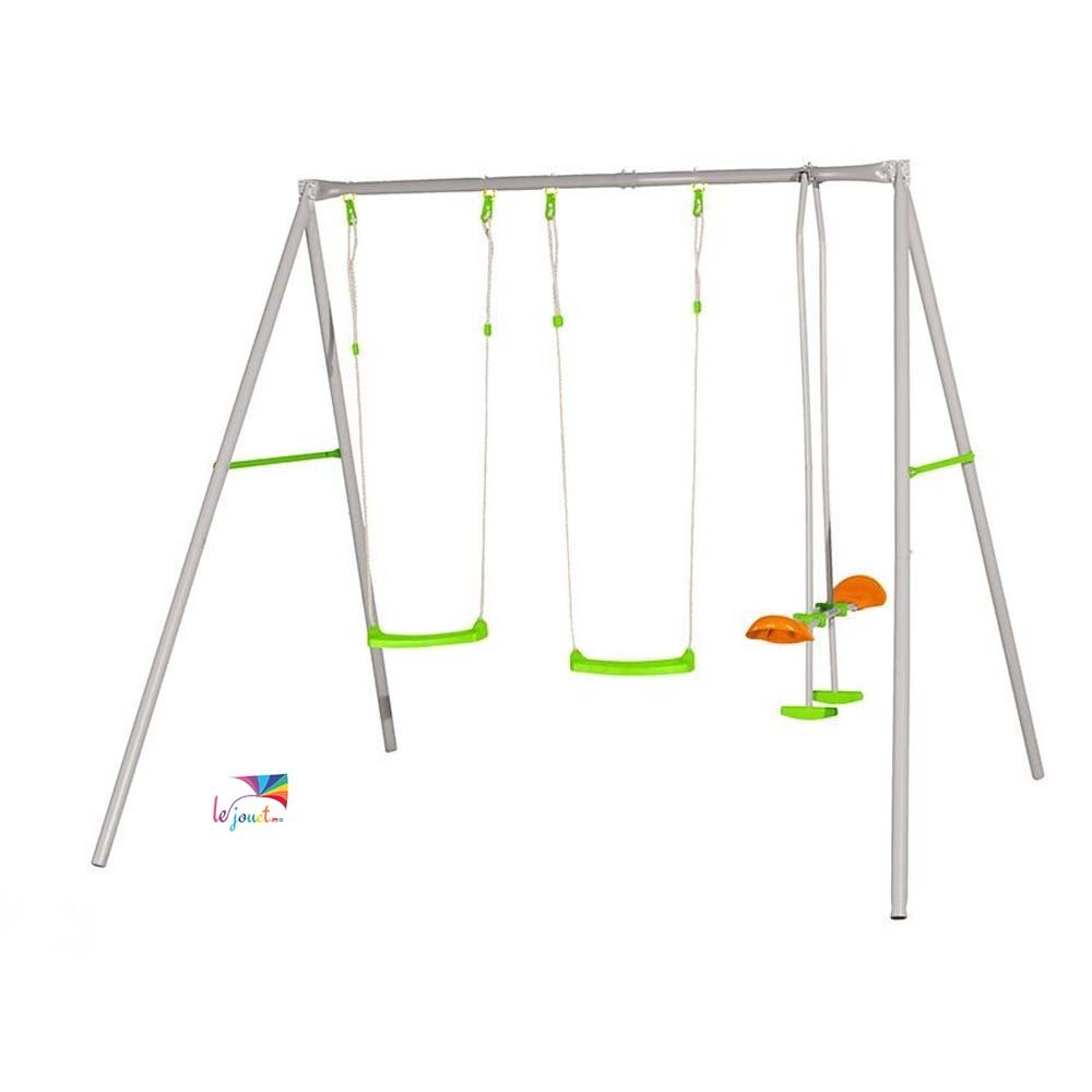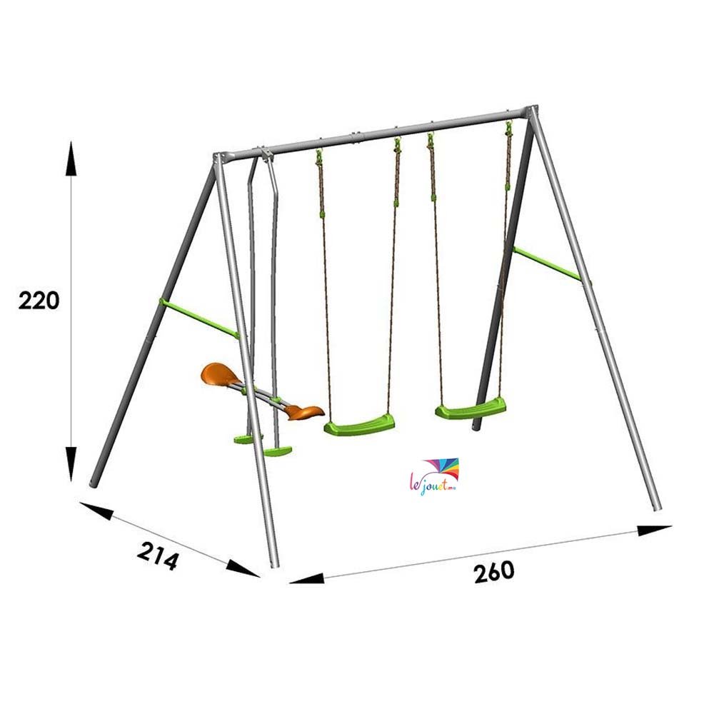 Ce Portique en métal axion conçu dans le respect des normes européennes et françaises est réalisé avec une structure en métal à la teinte grise afin de vous assurer un haut niveau de résistance. Composé de deux balançoires vertes ainsi qu’un face à face avec des sièges de couleur verte et orange.