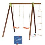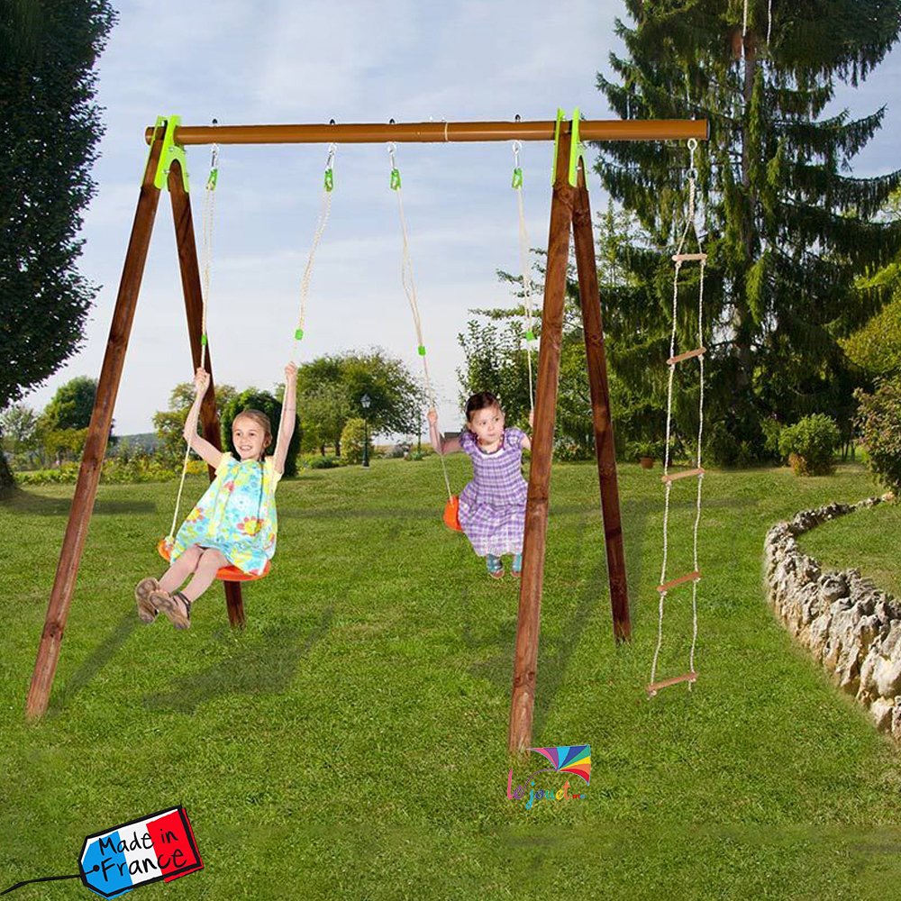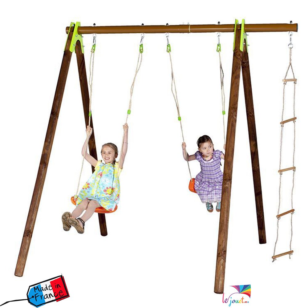 Ce portique Trigano est livré avec trois agrès : deux balançoires et une échelle de corde. Il est pensé pour accueillir jusqu’à trois enfants âgés de 3 à 12 ans qui pourront dès lors s’amuser en toute sécurité. Ce portique est en effet fabriqué en France dans le respect des normes de sécurité françaises et européennes, et dispose d’une poutre en métal compact extrêmement solide. Notez que pour une sécurité totale, il est impératif de sceller le portique dans du béton.