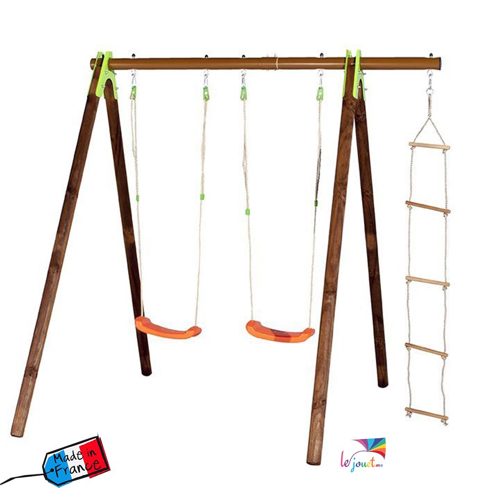 Portique XYLO bois métal 3 agrès – TRIGANO Fabriqué en France, dans le respect des normes françaises et européennes de sécurité applicables. il est conçu en pin traité autoclave. Est composé de deux balançoires et une échelle à cordes. Il peut être utilisé par trois enfants simultanément.