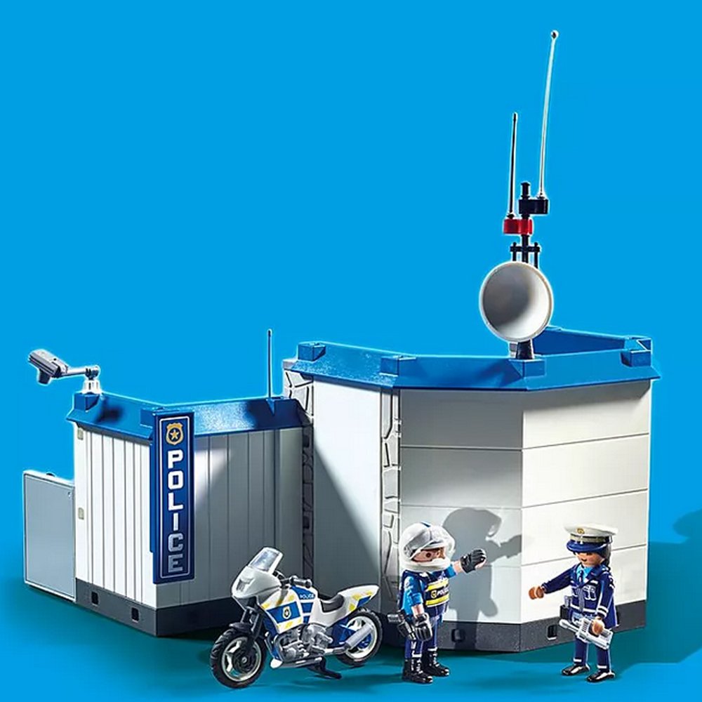 Ce coffret contient 161 pièces, dont : trois figurines Playmobil, le commissariat de police, une moto et des accessoires (radio, vaisselles, appareil photo, etc.).