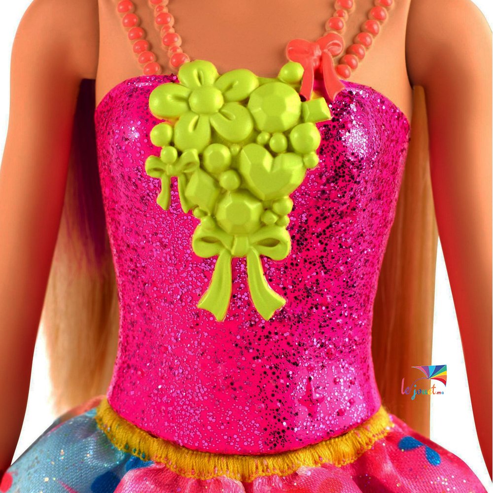 •Cette poupée Barbie Princesse Barbie Dreamtopia est vêtue d’un corsage scintillant et d’une jupe colorée à imprimé floral.