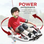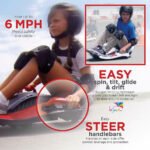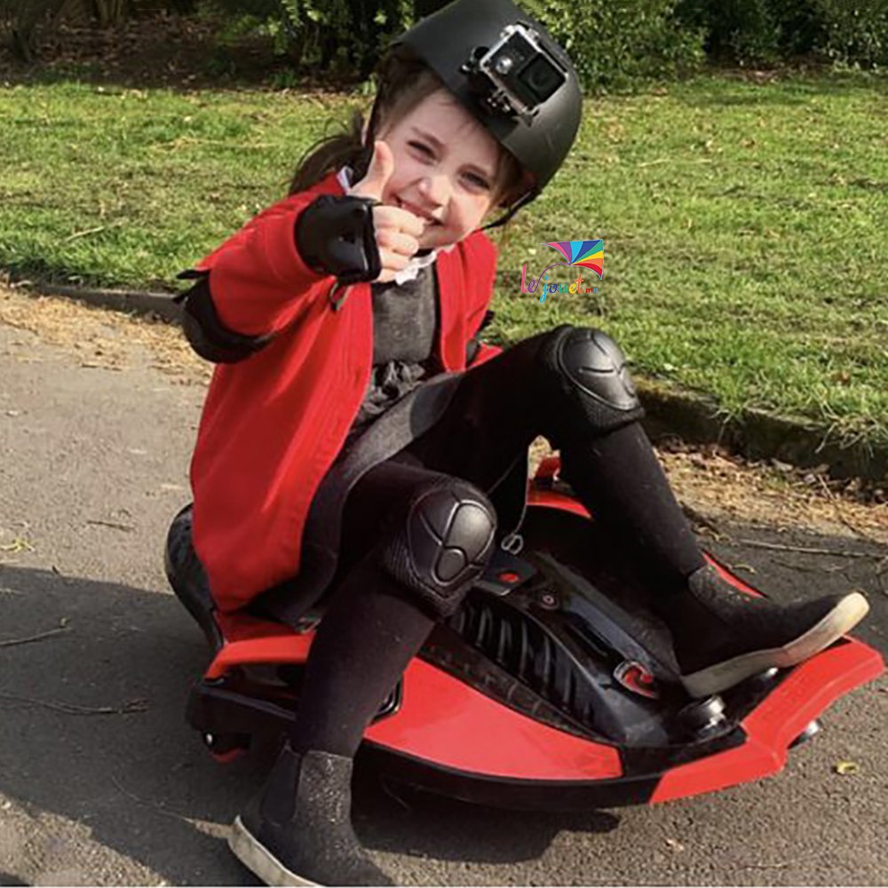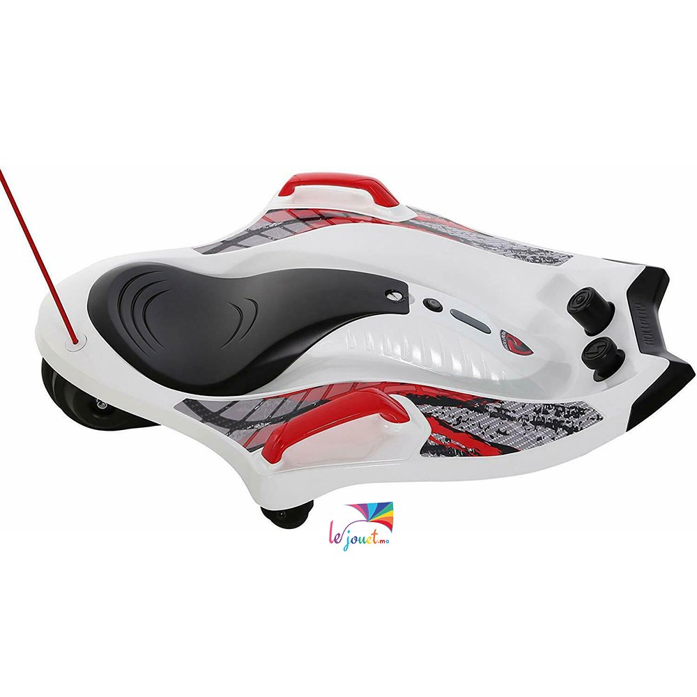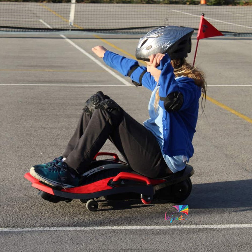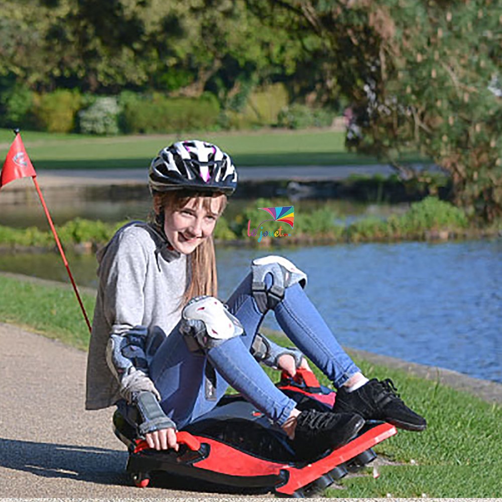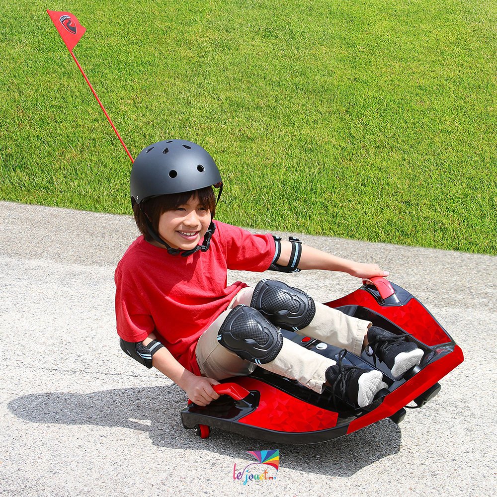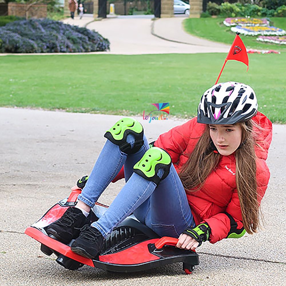 Sensations fortes garanties aux enfants! Pour une sensation de glisse au plus près du sol! Facile à piloter en position assise grâce au transfert de charge, Vitesse auto-ajustable, Pédale de frein, Rayon de braquage de 2m grâce aux 2 roues latérales pour des déplacements à 360°! Confort et sécurité: 2 poignées latérales de protection et de contrôle, Visible grâce au fanion! Vitesse max. : 12 km/h !