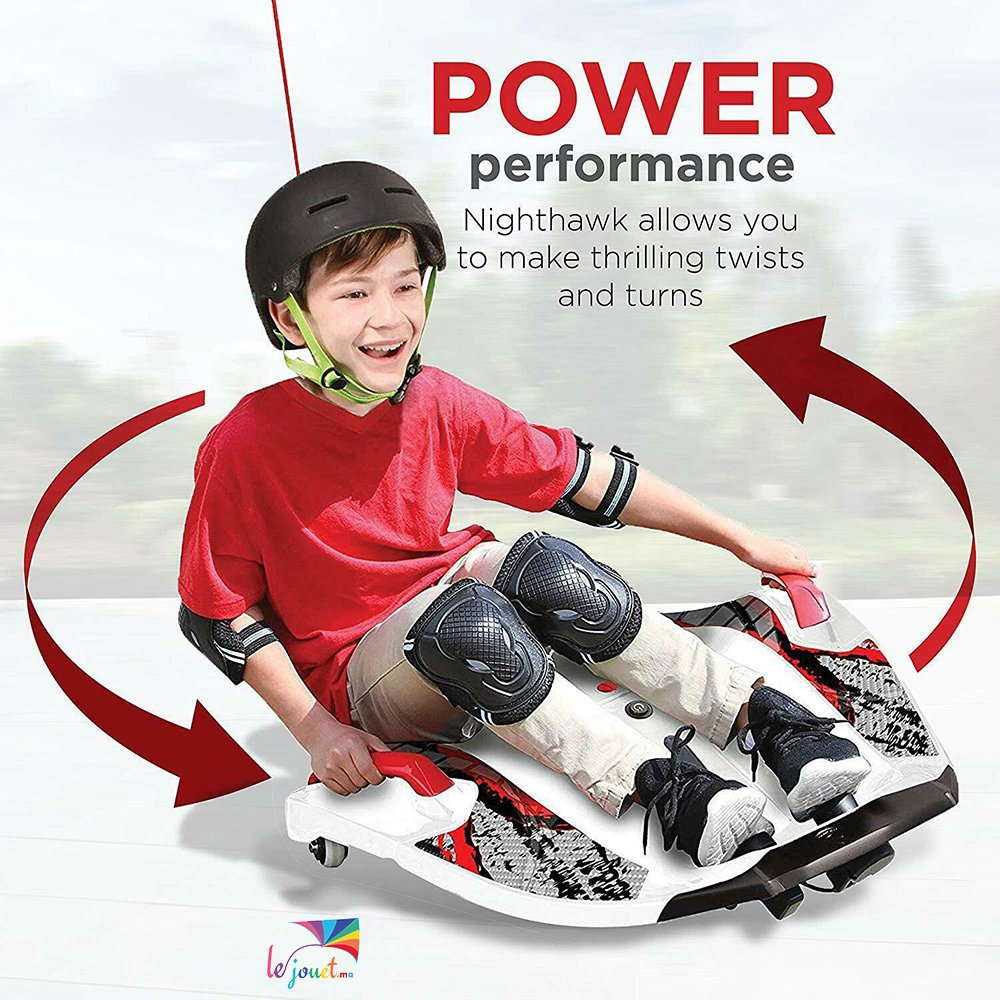 Grâce à son design hors du commun, le Nighthawk permet non seulement à votre enfant de se déplacer au plus près du sol tout en garantissant un confort maximal grâce à son siège ergonomique. Les deux poignées latérales de contrôle protègent les mains de votre petit pilote pendant la conduite.