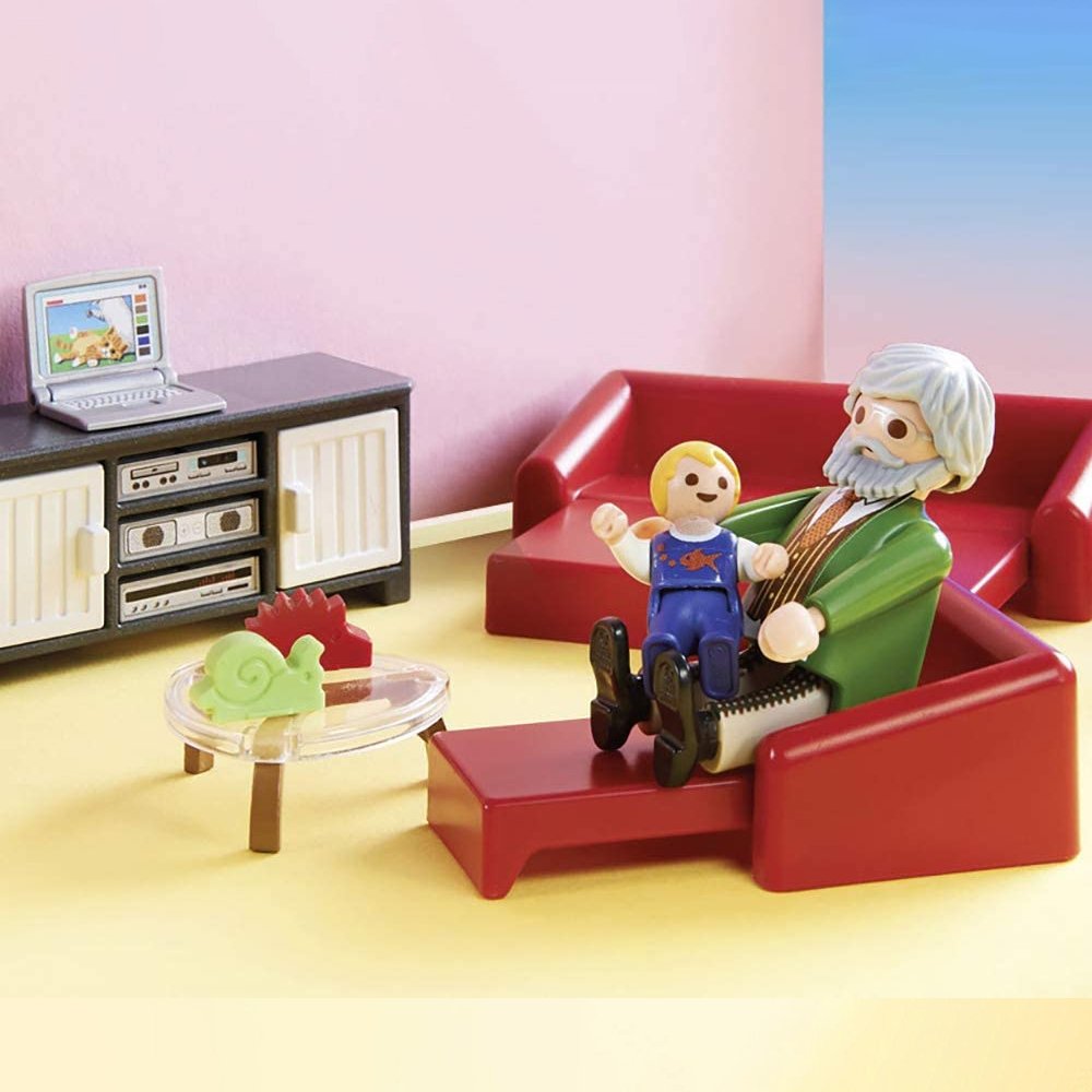 Salon avec cheminée Playmobil ! Le confortable salon est le cœur de la maison : toute la famille peut s’y détendre, lire, jouer et s’amuser. Pendant que son petit-fils s’amuse sur son cheval à bascule, papy profite de quelques minutes de calme sur son confortable fauteuil face à la cheminée.