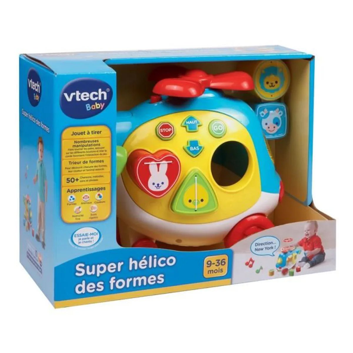Un super hélicoptère avec classeur de formes !Apprentissage des couleurs, des animaux et des formes1 classeur de formes avec 4 pièces illustrées avec des animaux2 hélices à tourner4 boutons pour apprendre les opposés Les 4 boutons déclenchent des phrases amusantes, des phrases chantées et des mini-chansons Cordelette pour faire rouler l’hélico5 chansons et 6 mélodies Réglage du volume sonore et arrêt automatique. 2 piles LR6 incluses.