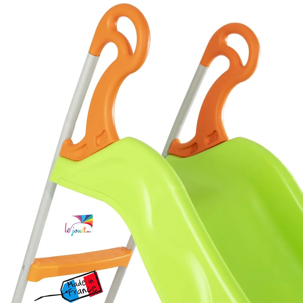 Côté sécurité, il n’offre que des atouts. Sa structure métallique robuste est garantie 10 ans et les plastiques sont résistants et choisis pour leur qualité renforcée. La stabilité est accrue grâce à la barre stabilisatrice et aux piquets d’ancrage. Les échelons antidérapants et les grandes poignées orange rendent son ascension plus sûre. La descente est guidée par de hauts rebords de glissière (15 cm) et l’arrivée se fait en douceur grâce à la sortie redressée.