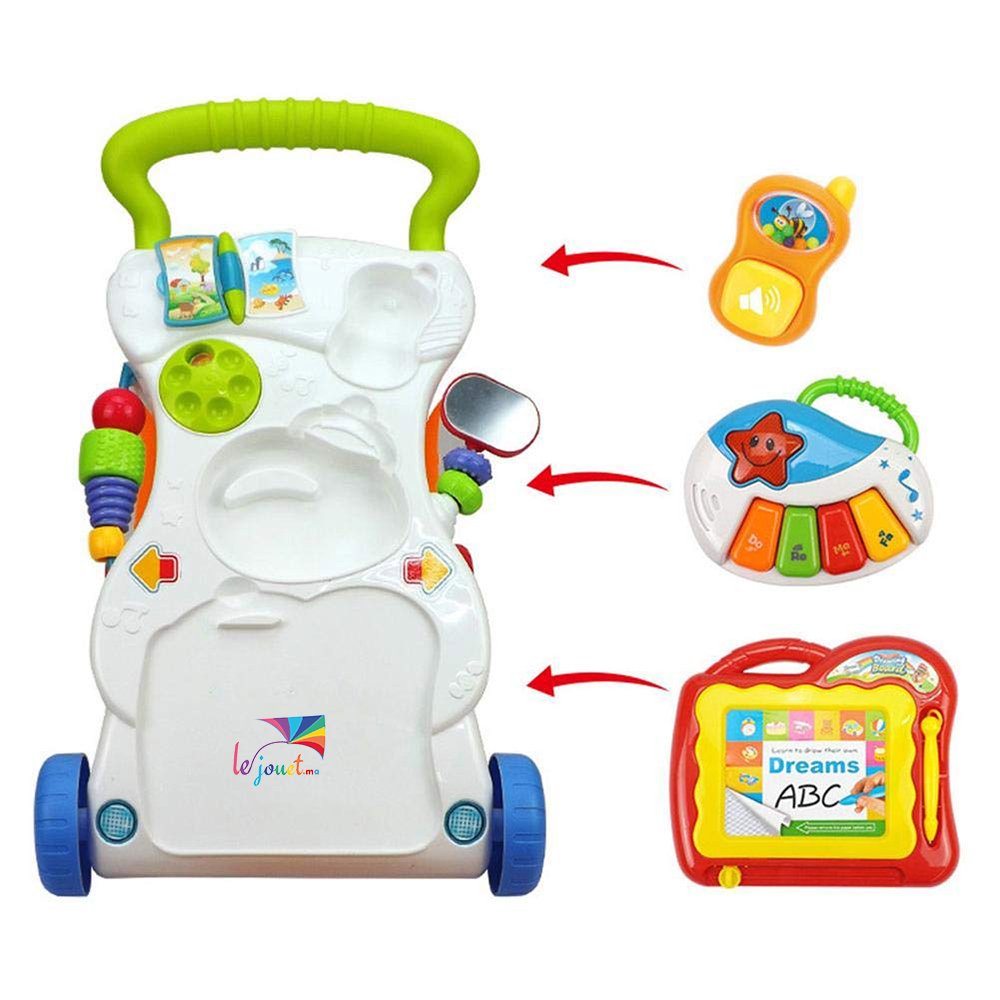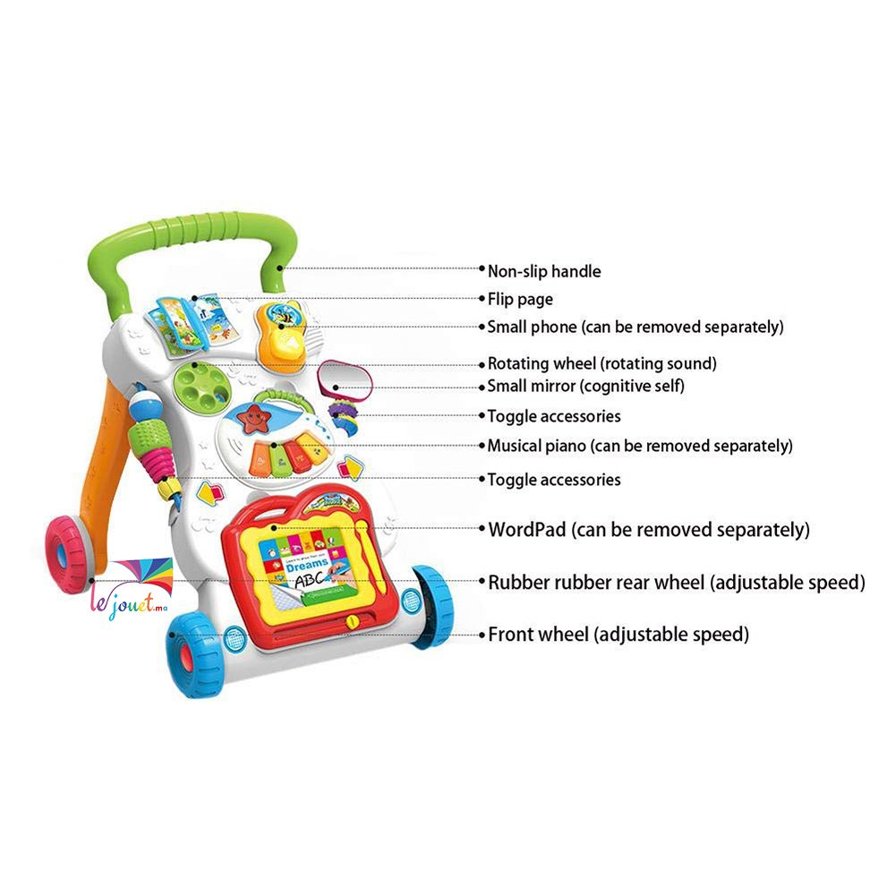 Ce trotteur d’apprentissage interactif et multifonctionnel comprend un panneau de jeu détachable, composé d’un jouet et d’un trotteur. Ici il aide bien bébé qui veut marcher partout et le divertit ac les petits jeux.